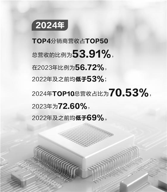 同时元宝枫资本,产业集中度稳中有升。据《国际电子商情》统计,2024年TOP4分销商营收占TOP50总营收的比例为53.91%,在2023年比例为56.72%,2022年及之前均低于53%;2024年TOP10总营收占比为70.53%,2023年为72.60%,2022年及之前均低于69%。